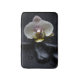En minsta vit orkidé i skarp kontrast mot svarta stenar.