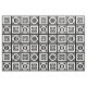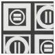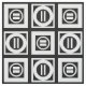 Geometrisk struktur för snyggt har vita fyrkanter med mellanrum mellan dem på en svart bakgrund. De diagonalt motsatta tjocka fyrkanterna innehåller var och en en tunn vit cirkel med ett tjockt likhetstecken inuti. De tunna kvadraten innehåller däremot en tjockt vit cirkel som vidrör kvadratens kant med ett tunt lodrät med samma tecken inuti. Digitalt skapat bild. Copyright © 2015 Claire E. Skinner. Alla höger reserverade.