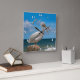 Denna vackra amerikanska vita Pelican är känd för sitt levande blå ögon och rosa öga ringar. Han utvecklar en knopp på sin näsa under häckningssäsongen. Han står på en sten vid kant i vatten och en fiskmås flyger över. Blå himmel fylld med puffa moln och vågarna om det blå grönten hav är hans bakgrund. Anpassa genom att lägga till egen bildtext, namn eller monogram.