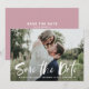 Vit penselhand, skrivet foto, sparar datumkortet. Snyggtens handskrivna foto sparar datumkortet med ett vackert penselskript med rosa längst bak i färg. Det här fotot sparar datumkortet är perfekt för vilken säsong som helst. Anpassa genom att lägga till ditt favoritfoto för vågrät.