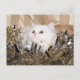 Vackert, vitsiskt kattunge i dekorationer med guldjulsgranar Katt älskar vykort för helgdag vid jul