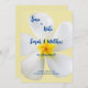En mjuk och delikat blommig design med en vit hawaiiansk Plumeria-blomma på en mjuk gul bakgrund. En perfekt paketlösning för bröllopsinbjudan för strandbröllop, hawaiianskt bröllop, tropiskt öbröllop med mera. Den hawaiianska betydelsen av Plumeria-blomman är "nya början" och "positivitet". Båda är perfekta för det nya början i ett äktenskap.