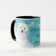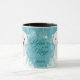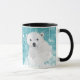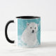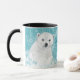 Den söt vintern mugg har en vacker vit polar mot ett blå himmel med vitt snöflingor. Fluffyvita moln omger björnen vid grund. Bilden trycks på två sidor av mugg, med mörkare tealmanus vid mitten som säger "Tro på magiken". Ditt namn eller annan text finns i grund.