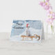 Vacker vit poodle på en släde i en snöig bakgrund med en tomtehatt hundälskare julkort