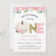 Vita Pumpkin Blommigt Guld 1:a födelsedag Kute faller, pumpa upp den första födelsedjuren med en stor vit pumpa, guld och rosa brev, rosa blommigt Ord och några arrangemangare guld glitter. Flickans första födelsedagsinbjudan är ett sött sätt för gästerna i inbjudan att gå till hösten eller falla på pumpa första födelsedagsfesten.