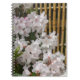 En bärbar dator med spiral-format för anteckningar och journalföring som har en omslagsbild av vita rododendron som växer längs ett prydnadsbambu-stängsel. En underbar, blommigt design!