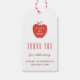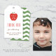 Skapad för att samordna med samlingen "Wavy Apple" för förskoleavgångsmeddelanden, har denna presentetikett för festligheter en söt äppelillustration i halvtone med en överlagring av texten "Class of (År)". Under illustrationen står en hälsning som lyder "Tack", följt av det anpassade meddelandet och detaljerna. Texten och designen är placerad mot en enfärgad vit bakgrund. Baksidan av etiketten har ett koordinerande grönt och vitt vågmönster. (Obs: För en mer anpassad design, byt ut det vågiga bakstycket mot ett foto av ditt barn.)