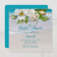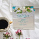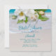 Beach ro inbjudningskort för möhippan. Kvadratkort med vit ros och tropisk strandbakgrund. Anpassa den blå akvatexten över en jämn sandbakgrund. Ett gäng vit ros och knoppar med greenery dekorerar toppen över tropiska blå vatten.
