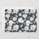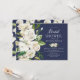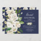Blommigt inbjudningskort för möhippan med vackra handmålade blommor av vit ros som satts på en midnattsblå bakgrund. Vänd över inbjudan för att visa en samordnande blommigt tillbaka för en speciell beröring i extra.