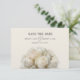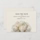 Ett bröllop spara datum-kort med en bild av vit ros i grund. Anpassa texten med information om tillfälle.
