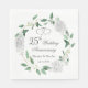 Elegant 25:e Bröllop-årsdagen Napkins med en vattenfärgsillustration av eucalyptus löv, vit ros och baby andas små blommor. Anpassa med namn och datum.