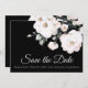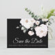 Fintvätt vit ros i elegantens övre lämnat hörn sparar datumkortet med svart bakgrund. Information om bröllop spara datum och ytterligare bröllopsinbjudan och bröllop webbplats i baksidan i lätt grått-typografi för kontrast. Foton med platshållare kredit Hannah Stevens, tack.