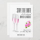 Kvinnlig vacker design kombinerar elegant vit bakgrund med fantastisk modern typografi och rosa blommor samt champagneglas. Spara datum-kort för ditt bröllop är viktigt och du förtjänar det bästa. Denna eleganta och lyxiga design kommer att vara perfekt.