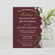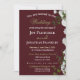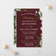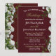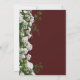 Denna klassiska bröllopsinbjudan har en charmig mörkröd bakgrund kantad med vita rosor och grönska på höger sida och sträcker sig från topp till botten, kompletterad med bröllopsinbjudan text i vit och guld färg.