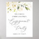 Vita rosor, grönt och guldgrönt bladverk Förlovningsfest välkomstaffisch. Texten "Förlovningsfest" är skriven i modern kalligrafisk stil. Överst - gyllene och grönaktig effektkonfetti.