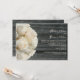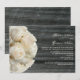 En bröllopsinbjudan med gammalt virke som bakgrund på framsidan och baksidan. Framsidan har en bukett vita rosor till vänster. Personalisera texten till höger med detaljer om ditt evenemang.