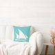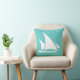 del av det havsinspirerade inredningstillbehöret vit segelbåt på turkosblå kudde på ena sidan och turkos och vit randig baksida.