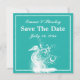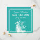 Vita sjöar på blå grönt sommar bröllop spara datum med vit sjöfågel och vit prickad ram på lätt havs grönt. Idealisk för sommaren, strandtemed bröllop.