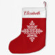Vit snöflingform på rött med eget namn liten julstrumpa
