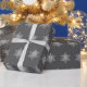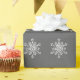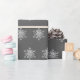 Backa dina presenter med vitt snöflingor på gråttets helgdag i bakgrunden pappert.
