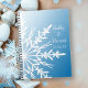 Vit snöflummel på blå vinter-bröllop anteckningsbok med spiral