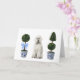 De här hälsningskorten har en vattenfärg porträtt i en vit standard pudel sitta mellan två topiarier i stil.