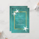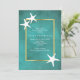 Vit stjärnfisk på teal nedfläckad grunge papper, modern inbjudan till förlovningsfest på strandbröllop eller inbjudan med en guld ram på mörk vattenhaltig tealblå bakgrund och vit stjärnfisk på hörnen. Den här sommarens bröllop-utformning i elegant är en del av en uppsättning eller samling av bröllop och är en perfekt av hela anpassadet för en stranddestination sommaren bröllop.