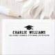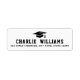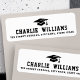 Vita eller anpassningsbar färg studenten returetiketter med en studentmössa med ditt namn nedan i ett stil-typsnitt för skollegiet. Svart text eller anpassningsbar färg på vit eller anpassningsbar färg bakgrund.