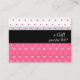 Presentkort - den härliga exklusiva designen som presenterar en svart-, vit- och rosapolka, pricker design. Gör en underbar presentkort för skönhetsalonger, brunnsorter, cosmetologists, nagelsalonger, dansstudior, boutiques, formgivare, hår- och modestylister, återförsäljnings- professioneller, etc.…, Anpassade 100%. Redo som in fyller, Gjort med kickupplösningsvektorn och/eller digitala diagram för ett yrkesmässigt tryck. NOTERA: (DETTA ÄR ETT TRYCK. Alla zazzleproduktdesigner är "tryck", om inte annars påstått under "härom produkt" område,) som den ska designen är den utskrivavna EXAKT något liknande, du ser den på skärmen och på produkten…, så behaga ser till när du gör dina ändringar på resizingen av några av diagrammen eller texten som det passformar i områdena korrekt och, som ditt stava och att uttrycka är hur du gillar den för att vara i format, färg och stilsort. Om du har, ifrågasätter någon härom design behar kontaktar mig på siggyscott@comcast.net eller besöker mitt lager anknyter: http://www.zazzle.com/designsbydonnasiggy?rf=238713599140281212 (kopierar och deg) som jag ska, är lyckligt att hjälpa. Tacka dig för servicen och att stoppa vid mitt lager - DesignsbyDonnaSiggy. © Donna Siegrist