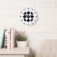 En väggklocka med ett tema för tävla av svarta och vita fyrkanter på ansikte, svarta siffror och minuter med svart markering. Klicka på Anpassa om du vill ändra färg för bakgrundsinformation med mera.