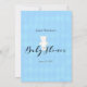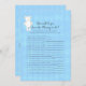 En vit teddybjörn nära spelrubriken med babyblå, diamantargylebakgrund. Mallar skapade för dig. Detta är ett Vem vet blivande mammas bäst barnkalas-spel.
