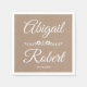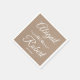Handskriven typografi, vit blomma, papper, rustik blommigt bröllop papper napkin. Den visar namn i ett kursivt skript med handskrivet stil-typografi och två små vita blommor med löv på båda sidor om storytan.