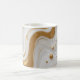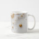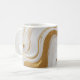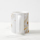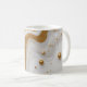 Mugg nedsänkt i en glansig, vit vätska med gyllene droppar täckt med en patina med vätska och silkesfärg. Ovanför dessa droppar skiner guldpartiklarna glitter något, som om de flyter på yta, vilket ger elegant och lyxfärgad beröring till designen.
