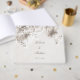 Denna eleganta tysta lyxiga bröllopsgästbok har vita skulpterade rosor på en vit bakgrund, brud och brudgum namn i en elegant modern teckensnitt och handskriven skrift.