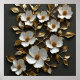 Utsmyckad design med flera konstnärliga blomsterdetaljer. Blommorna är avbildade i vitt med gyllene konturer och visar intrikata detaljer i kronbladen och centrum.