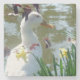 Den här söta vita anka vajade vid vatten kant kring den heliga gulten daffodils. Ett glatt av solsken på vatten och anka bidrar till den soliga stämningen. Fotografiet är härligt på dessa underlägg där anka kommer att ge ett leende till alla besökare ansikte. Kan ge en underbar gåva till en person eller ett par som love birds, ankor och vilda djur och växter.