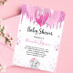 För en babydusch, fira en flicka. En vit snyggt bakgrund. Dekorerad med faux glitter, rosa ballonger och en elefant flicka. Anpassa och lägga till uppgifter om namn i mamma till namn och party. Namn och texten: Baby Shower är skrivet med ett handskript i stil