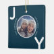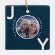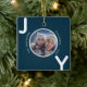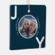 En modern, minimalistisk julprydnad i blått och vitt. En klassisk blå bakgrund, med ord JOY skriven med vitt fet brev. Brev O används som foto på ram. Anpassa och lägg till ditt eget familjefoto, namn och år.