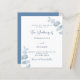 En vit bakgrund, dekorerad med dammiga blå eukalyptus-stammar, spriggar. Anpassa och anpassa namn och detaljerna. Baksida: dammig blå bakgrund.