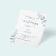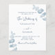Observera att inbjudan är papper och mycket tunn. Kuvert ingår inte. Om du vill ha mer omfattande inbjudningar (samma design) kan du besöka vår butik. En vit bakgrund, dekorerad med dammiga blå eukalyptus-stammar, spriggar. Anpassa och anpassa namn och detaljerna. Baksida: dammig blå bakgrund.