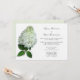 Vita blommor, spotlight hortensia, bröllopsinbjudningar. Stor vit blomma med gröna blad skapar en elegant inbjudan för alla säsonger, med utrymme att inkludera adressen till mottagningen. Horisontell layout med ljust grön baksida.