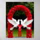 Två vita duvor möts under en röd rosbåge prydd med pärlor, vilket skapar en lugn och romantisk atmosfär, symboliserar kärlek, fred och enighet. Perfekt för romantiska och bröllopsteman.