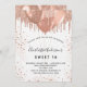 För en elegant 16, 16:e födelsedag. En vit snyggt bakgrund. Dekorerad med ro guld, faux glitter, målardroppar och ballonger. Anpassa och lägg till information om namn, ålder och party. Namn är skrivet med ett handskript i stil