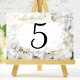 Anpassa de här Bordsnumren för söt White Hydrangea Flowers Watercolor för varje bord vid möhippa, födelsedagsfest eller giftermål-mottagning av inspirationstemat för party i sommarträdgården. Dessa bordsnummer i anpassningsbarna har en digitalt vattenfärgad, färgad, nära blommigt fotografi av vita blommar av vattenblommor med vit bakgrund.