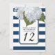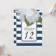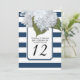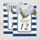 Bordskort för din bröllopsfest, födelsedagsfest, bröllopsmottagning eller annan formell tillställning. Handmålade vita hydrangeor är parade med ett modernt brett randigt mönster i marinblått och vitt med en tunn silverglitterkontur. En ram i art deco-stil med utskärningar i hörnen fullbordar designen. upphovsrätt, Audrey Jeanne Roberts.