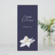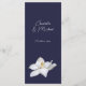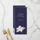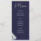 Vit Magnolia Elegant Blommigt på Navy Bröllop Menu designad med en klarsynt Magnolia blommar på marin bakgrund. I texten på framsidan finns: Namn, Bröllop-datum och Menu. Baksidan är en matchande marin bakgrund med text: Meny, Appetizer, Entre och Dessert och Markeringar för varje. Om du vill anpassa dig infogar du bara dina uppgifter i vår enkla mall och ersätter exempeltexten. Se till att du kan se hela Blommigten White Magnolia Elegant on Navy Bröllop Collection för matchande papper.