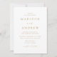 Minimalistisk, modern bröllopsinbjudan med dina bröllop-detaljer i guld-brev med calligraphy-skript-accents. Den vita bakgrunden kan ändras till en valfri färg. Designad att samordna med vår moderna elegance bröllop-samling.