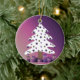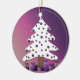 En söt vit Julgran med lila prydnadsämnen och lila inslagna presenter under den. En skuggad lila-bakgrund accentuerar den.