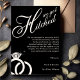 Elegant svartvitt bröllop-annonskort med glansig diamant ring och foto på baksidan. Anpassa den med din händelseinformation.