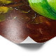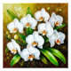En detaljerad konstverk av livfulla vita orkidéer kompletterade med frodiga gröna blad, visade mot en texturerad gyllenbrun bakgrund, som visar elegansen och skönheten hos blomsterarrangemang.